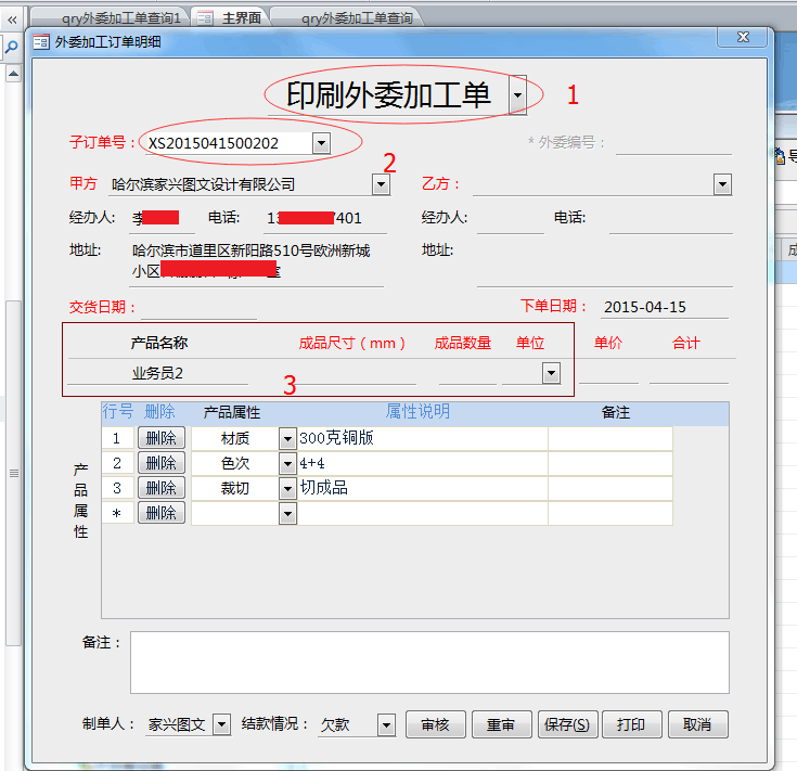 我想实现当1处选为印刷外委加工单且2位置更新后3位置各控件都有值?如下图所示: