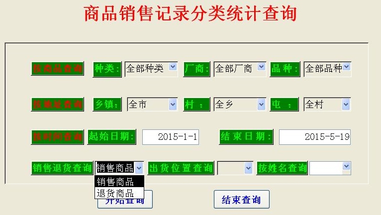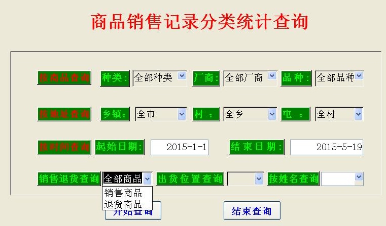在商品查询窗体上设计的“销售退货查询”文本框,文本框的商品”,文本框的行来源设置为:销售商品;退货商品。