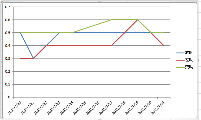各位大师请赐教,我想在窗体上建个图表,X轴为日期,Y轴0-1.2,值为【右眼】【左眼】【双眼】,做成如下图样式的,请问怎么做,谢谢