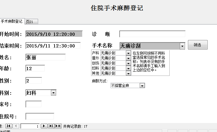姓名,年龄,性别,住院号等我做成了文本框,自行输入,科别因为比较固定,我做了一个科室分类表,窗体里的科室就做成了组合框,行来源填写为 SELECT 科室分类.id, 科室分类.科室名称 FROM 科室分类; 这样就可以避免人工手动输入了。下来的手术名称我也想如此,设计一个手术分类表,然后用组合框用来输入,但是问题是手术名称比较多,有40,50条之多,但是我在手术分类表里,有个字段是用来区分不同科室的手术的,我想能不能有什么办法,在前面的科室名称里面不是有了科室的选择,怎么样能够把手术名称这个栏目里面的内容筛选出来只显示当前患者所在科室的手术名称,这样不是就好选择了吗?我想了个本办法,我又重新添加了几个科室的经过筛选后的手术名称复选框都放在了窗体里,通过点击不同科室的手术名称输入框来进行确定手术名称。但是这样,输入窗体变得是不论不类了,不是很美观。我想,有没有一个比较简洁的办法,比如说在窗体里增加一个命令按钮,看看能不能试着把手术名称里面的行来源的where条件能够更改,但是好像在VB里面做不到,我对VB也是刚刚才接触。反正是捣鼓了半天,不得其解。