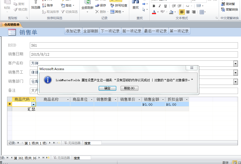 我的操作系统是windows7-32位,我安装了office2010,当我在进销存软件中输入销售数据时,出现以下问题,不知是为什么?