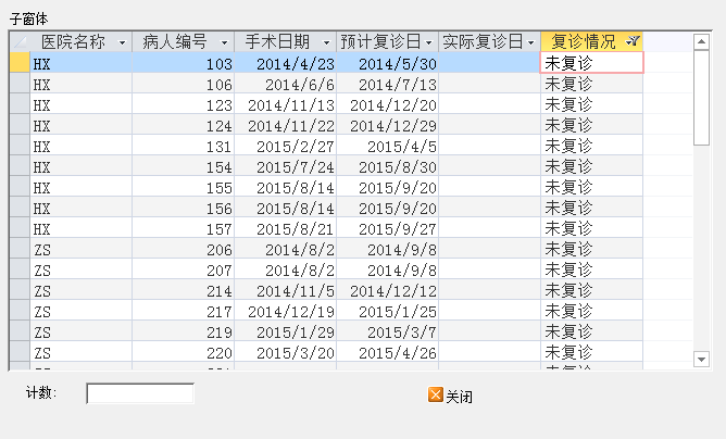 在子窗体页脚放一个文本框(如TEXT10,然后文本框属性里的控件来源写入:=count([复诊情况])