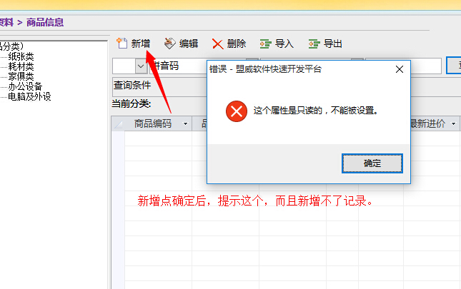 [5分]商品信息新增:点击保存,退出后提示:这个属性是只读的,不能被设置。
