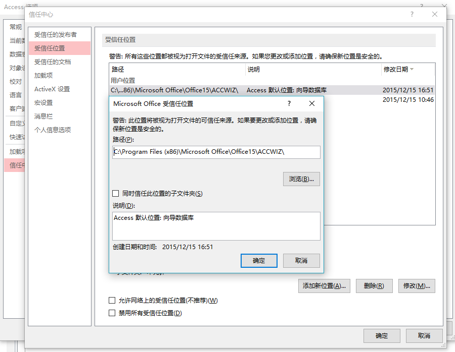 对比检查笔记本和台式机上的Access 2013的配置,...C: /program files (x86)/Microsoft Office/Office15/ACCWIZ/ 下的6个文件一样,也不缺任何一个。在信任中心-受信任位置,用户位置ACCWIZ也在。如图: