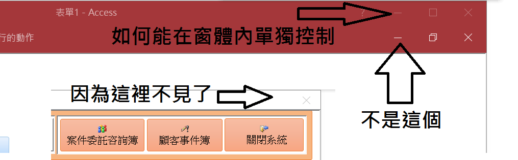 因本身ACCESS已被穩最大 和最小化按鈕了, 現想在窗體內制定一個按鈕指令, 使正在使用中的ACCESS整體最小化,並在WIN底部, 隨時可以回複。