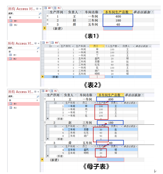 Access中,由《表1》和《表2》 通过 [生产序列] 构建成一个母子表,其中《表1》为主表,《表2》为子表。