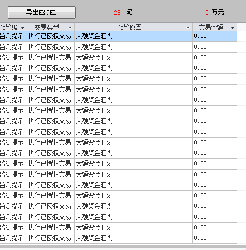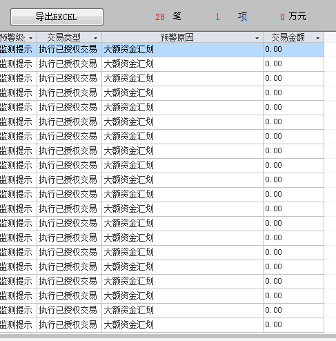 这是一个子窗体,通过(count*)得到笔数是28笔,但预警原因却只有“大额资金汇划”一项,怎么样才能去重计数为1项呢(我想增加一个文本框来统计预警原因项目数据)