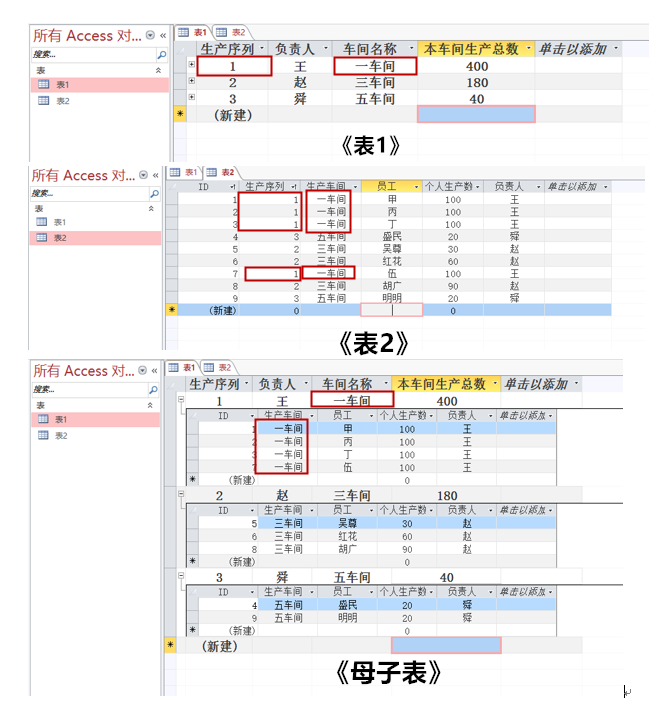 Access中,如何在《表2》的 【 生产车间】这个字段 实现自动输入 Access中,《表1》和《表2》 通过 【生产序列】 构建成一个母子表,其中《表1》为主表,《表2》为子表。 我的要求是在《表2》的 【生产车间】 内自动输入。也就是当在《表2》的【负责人】字段内输入数据时,《表2》的 【生产车间】自动输入 和《表1》对应的 【车间名称】。具体请看下图 求 《表2》【生产车间】 该字段的公式或VBA代码,可以通过窗体来实现