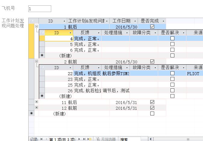 飞机号为主窗体  工作计划为子窗体 想实现选择不同的飞机号 下面的工作计划也随之改变