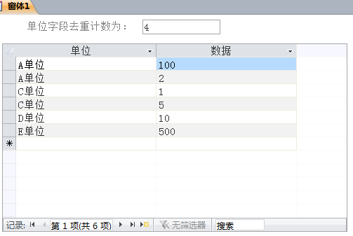 本例共有6笔记录,我需要的是子窗体中单位字段不重复计数,效果如图所示,显示ACDE4个单位数
