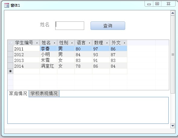 表1字段学生编号,姓名,性别,语言等 表2字段学生编号,家庭情部,学校表现情况,要实现多字段模糊查询,当点某一记录时选项卡能显示相应记录学生的家庭情况,学校表现情况