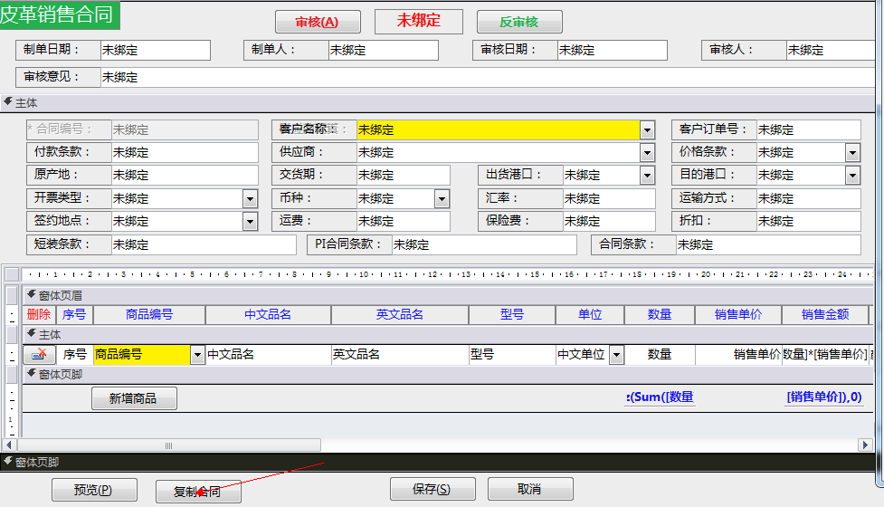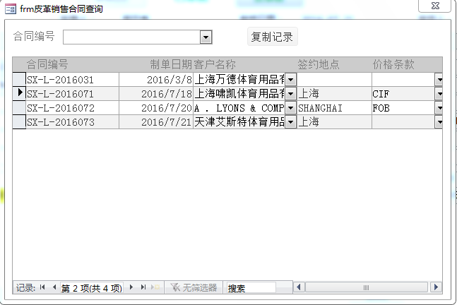 点击销售合同上的复制合同后弹出销售合同查询框,然后选择需要复制的一条后点复制数据,就能把以前的这条数据全部复制到对应的新增窗口中,包括子窗体的数据。