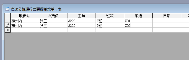 DoCmd.RunSQL "INSERT INTO 高速公路通行费票据缴款单(收费站,收费员,工号,班次,车道) VALUES ('" & 收费站 & "','" & 收费员 & "','" & 工号 & "','" & 班次 & "','" & 车道 & "')"