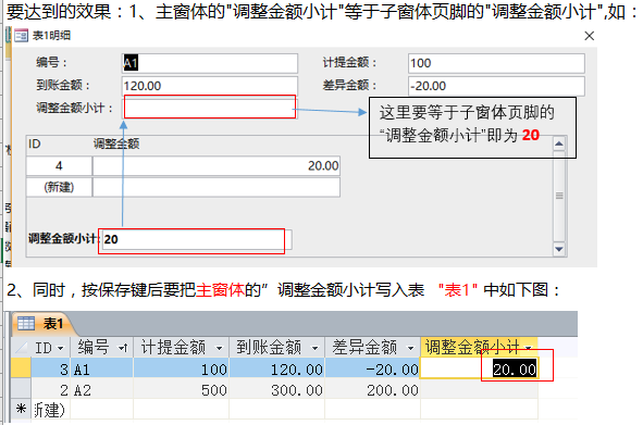 之前进了一个误区:调整金额小计=[Forms]![frm表1_Edit_Detail]![调整金额小计]