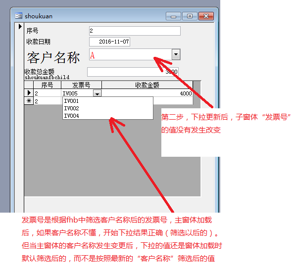 我做了一个收款的窗体,因为客户的汇款可能不是一个发票号的。所以是先选择客户名称,再选择发票号,现在的问题: