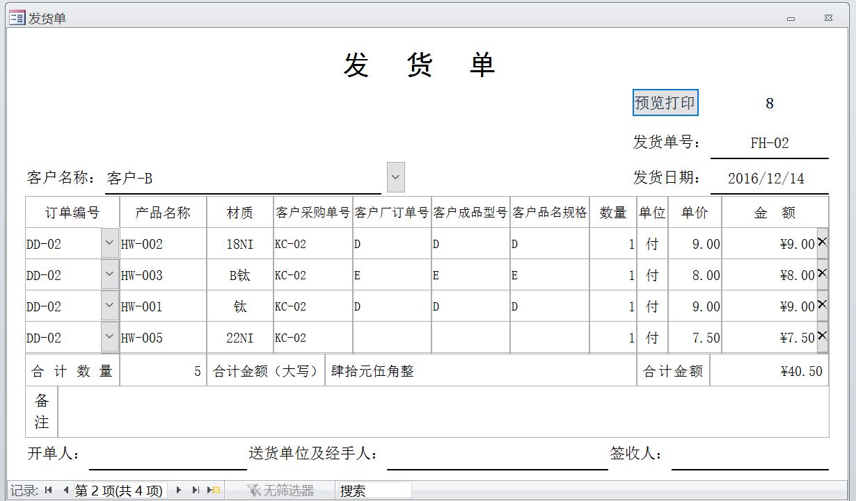 第2个问题:如何控制发货单输入的条数。票据打印纸长度有限,想控制产品输入的条数。 如何限制输入条数,并提示只能输入几条。比如提示最多只能输入4条。如图片发货单和发货单打印,发货单上显示是4条,实际上发货单打印所显示的是5条。