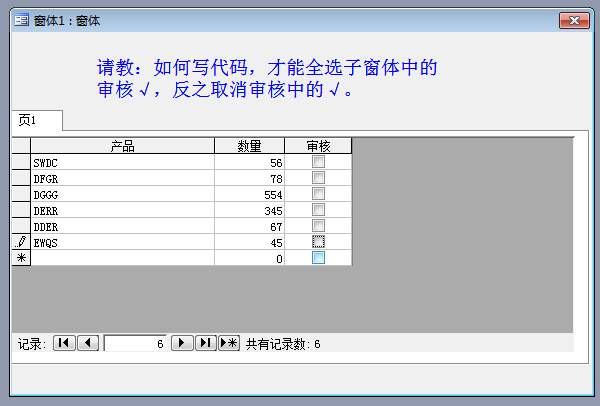 请教如何才能做到子窗体审核中全部打钩,反之取消全部打钩。