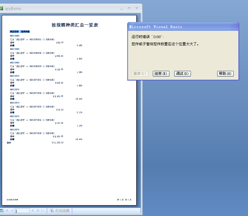 [5分]报表运行出现错误:2100,提示,控件或子窗体放在这里太大。